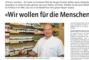 «Da hinten im Emmental führt der Drogist Christian Stettler seinen Allzweckladen in der zehnten Generation. Zu seinen Kunden gehören zwar auch Katzen und Kühe. Trotzdem ist dies keine Heile-Welt-Gotthelf-Story. Sondern ein Einblick in ein KMU, das sich an die Bedürfnisse einer ganzen Region anpasst.»